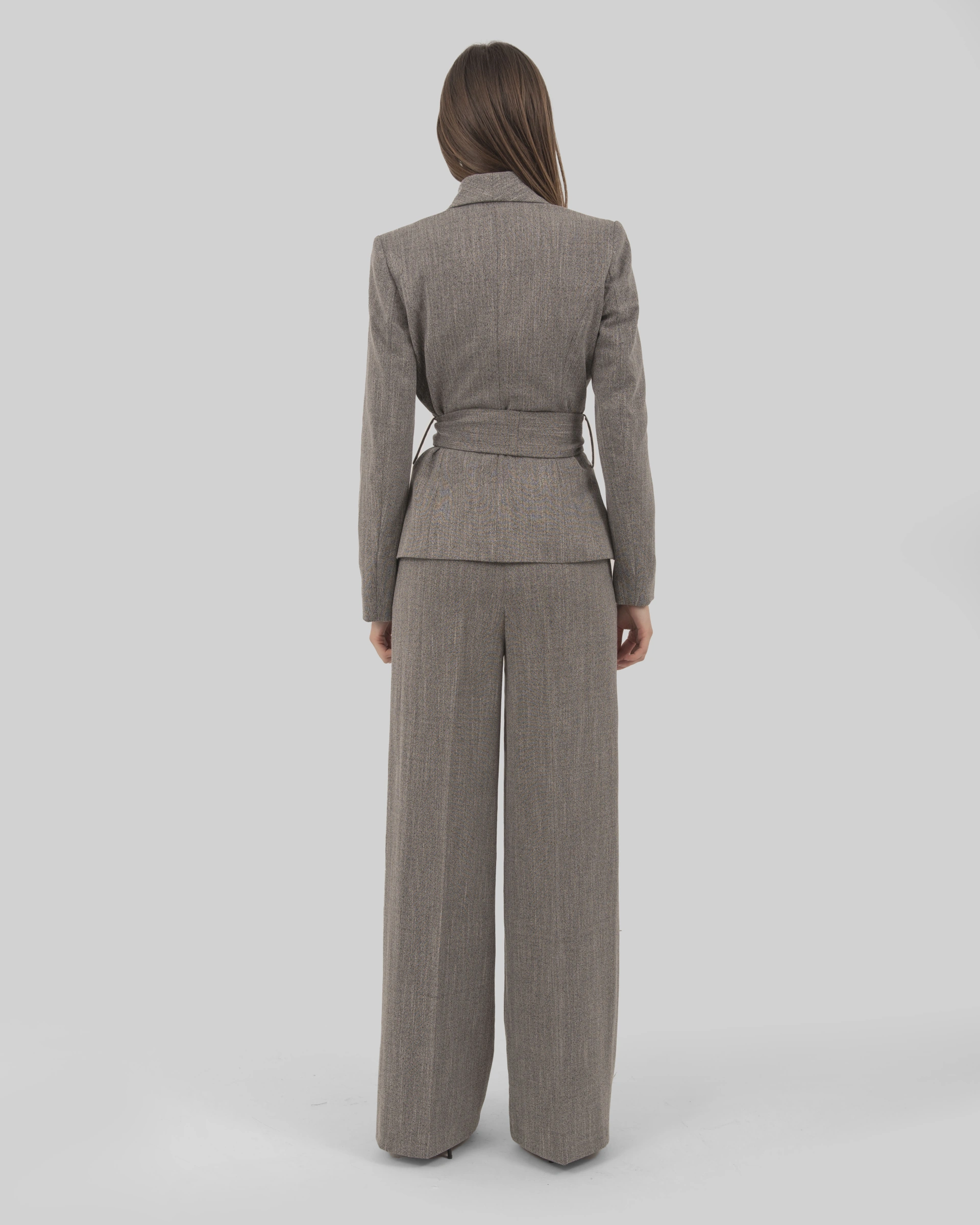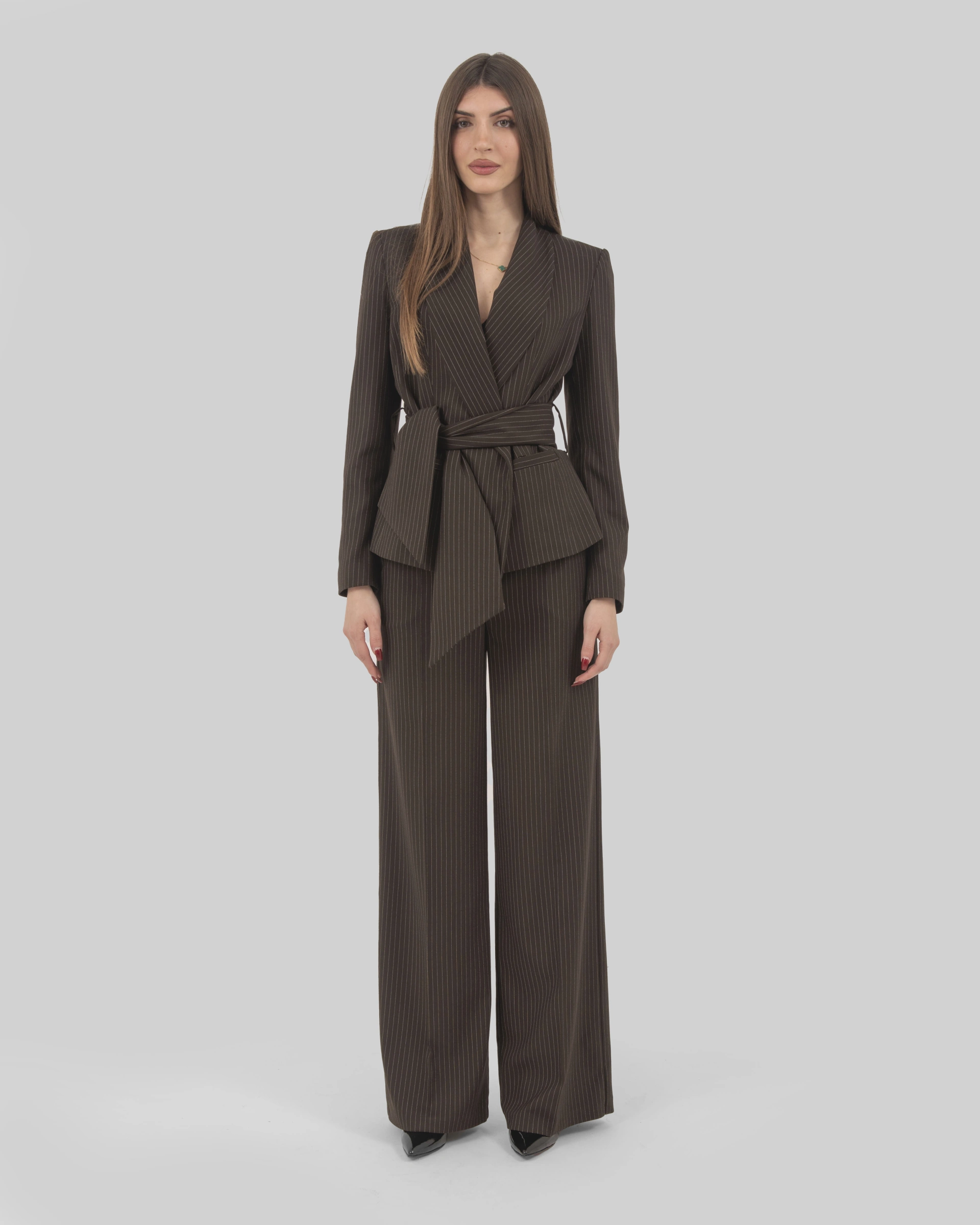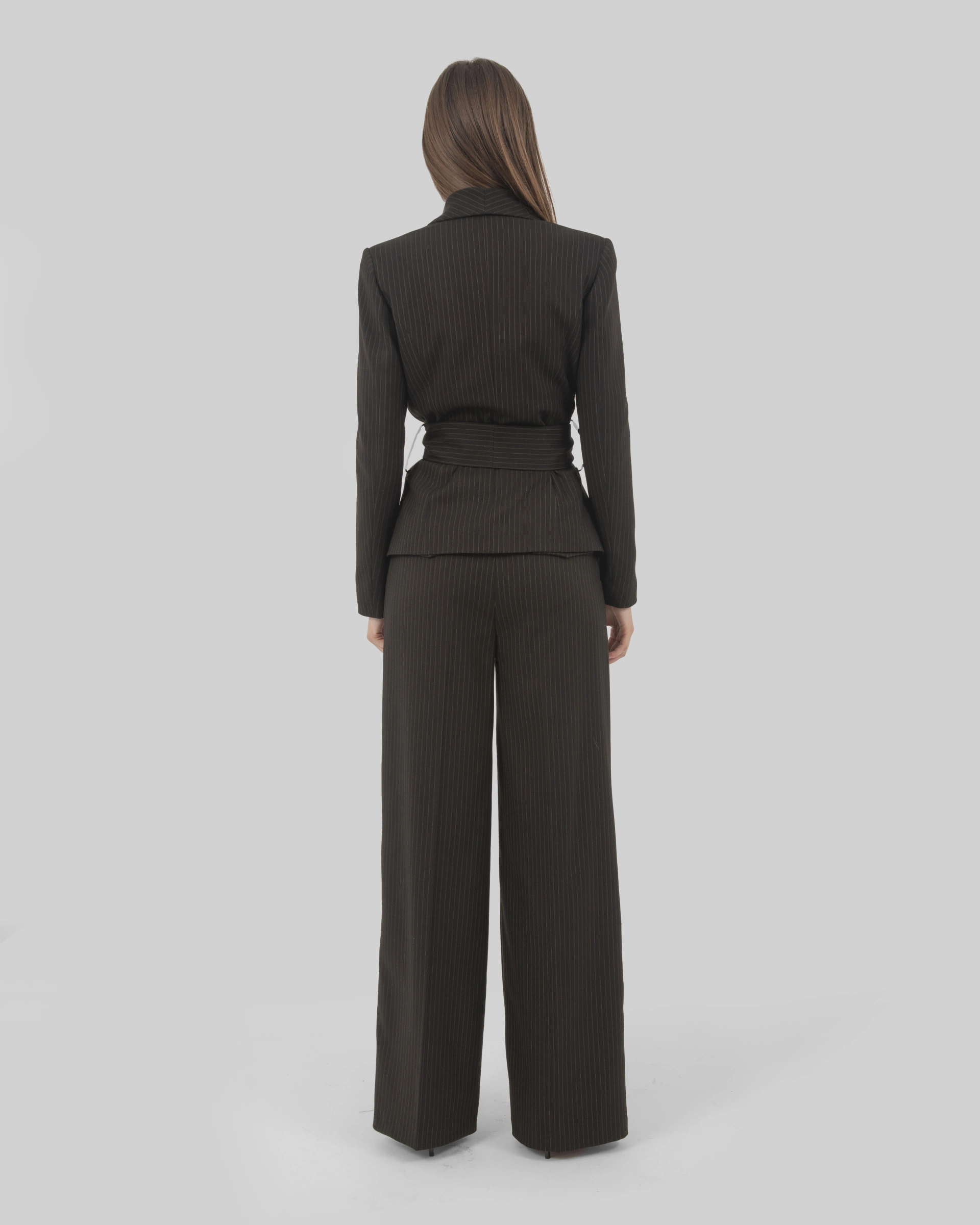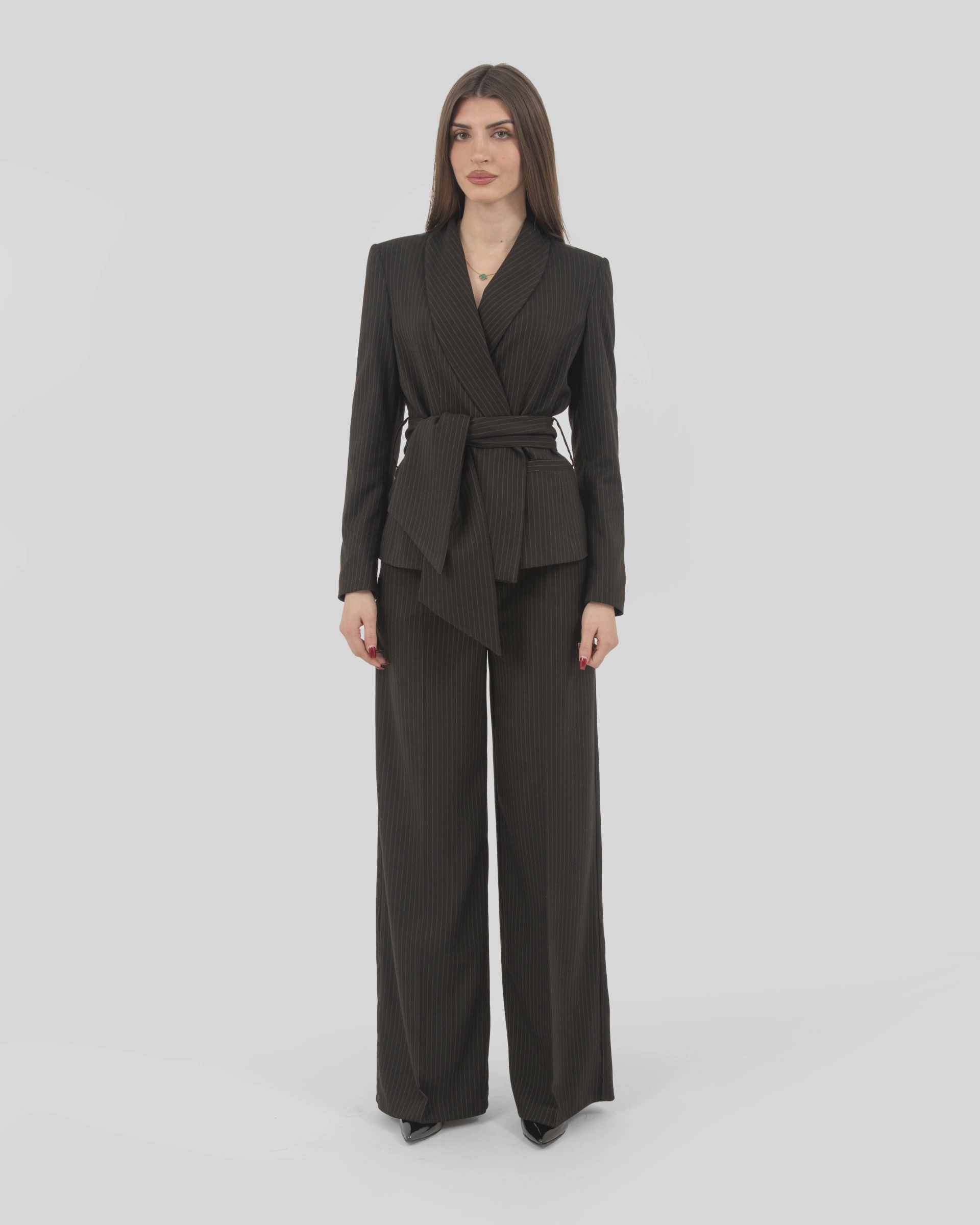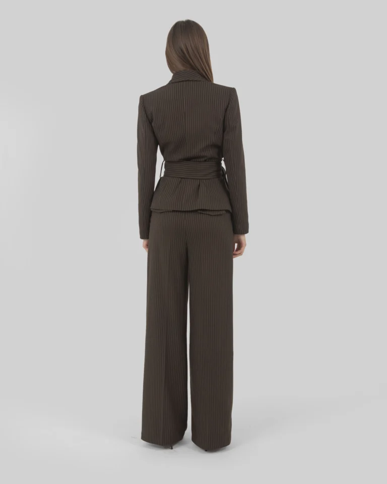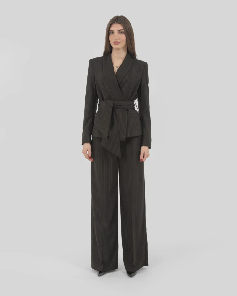 Tone-on-tone striped fabric jacket with shawl lapel and sash closure.
