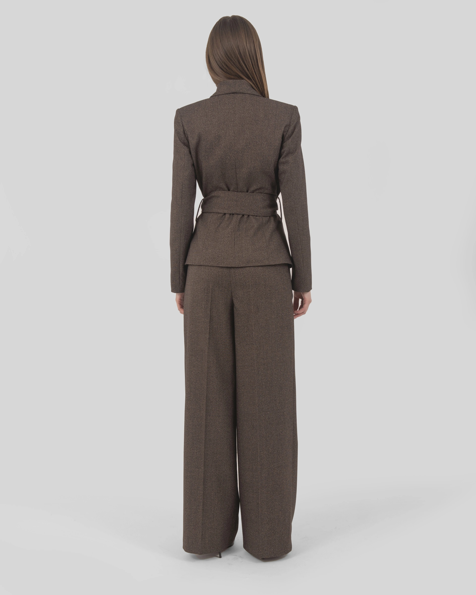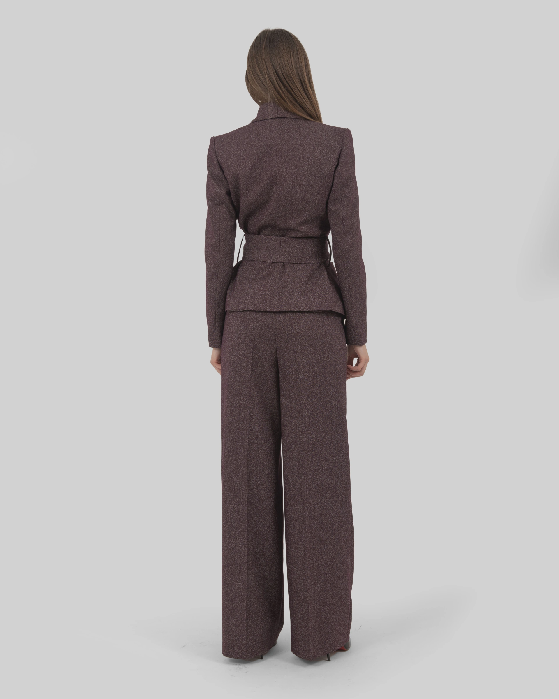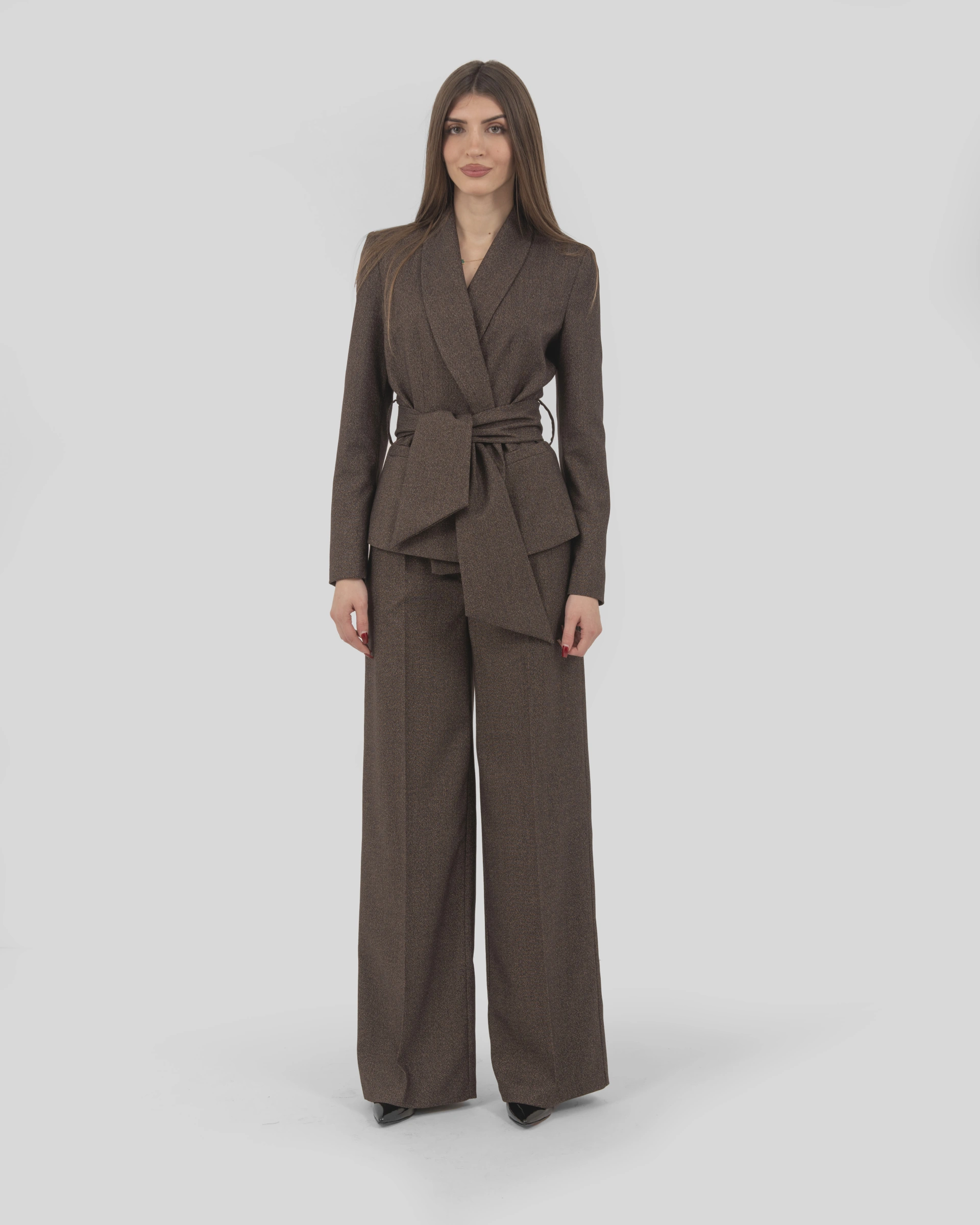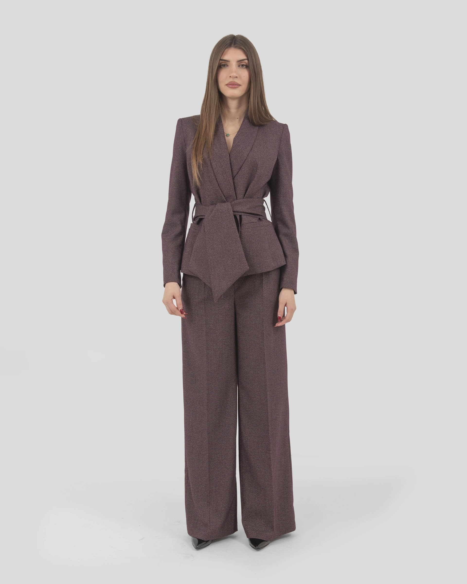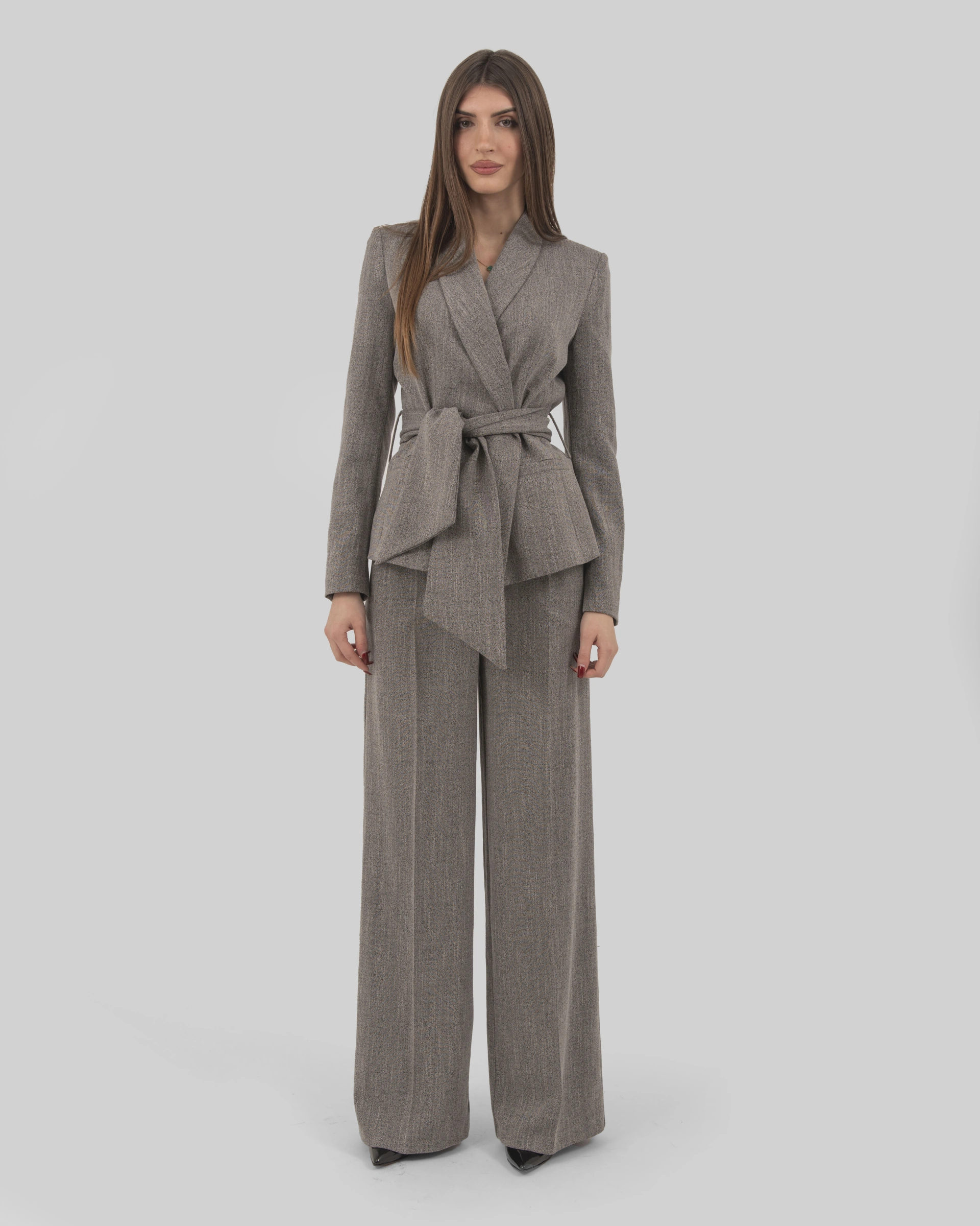 Tone-on-tone striped fabric jacket with shawl lapel and sash closure.