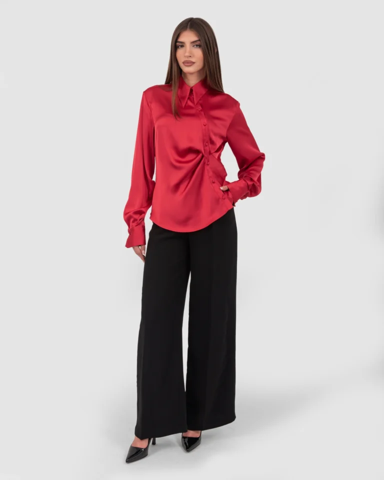 Satin shirt with asymmetric buttoning and front draping.